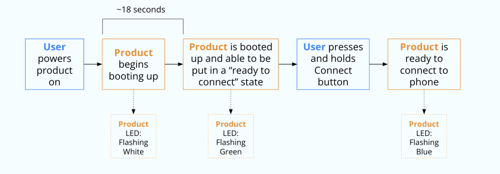 The primary mistake was that they were attempting to put the product in a “ready to connect” state before it was fully booted up and ready to do so, but the change in LED color made them initially think they were successful. Most participants troubleshooted on their own by looking at the instructions that came with the product or by simply trying to press and hold the Connect button again. Many indicated that the LED colors weren’t clear to them, and were hoping to find that information in the instructions. Some were completely stuck and eventually required assistance.