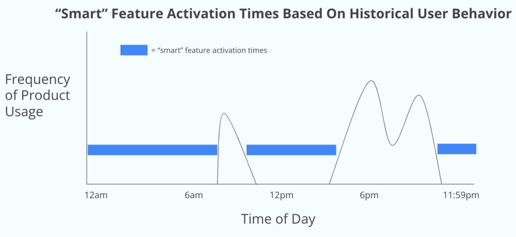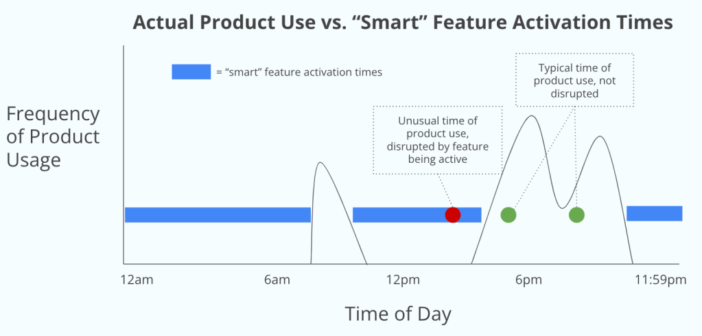 This helped me identify a critical issue with our feature being “smart”. If the system learned to activate the feature, which could be disruptive, at certain times based on historical usage, then any attempts to use the products at atypical times could cause a frustrating experience.