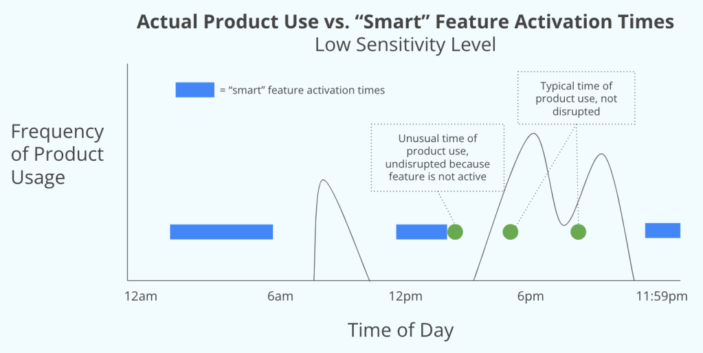 - Give users the option of varying “levels” of sensitivity to their behavior to determine when the feature would activate. Lower sensitivity levels would activate the feature less frequently to decrease the chance of disruption, but still be based on historical behavior. Therefore, a lower sensitivity level might look more like this:
